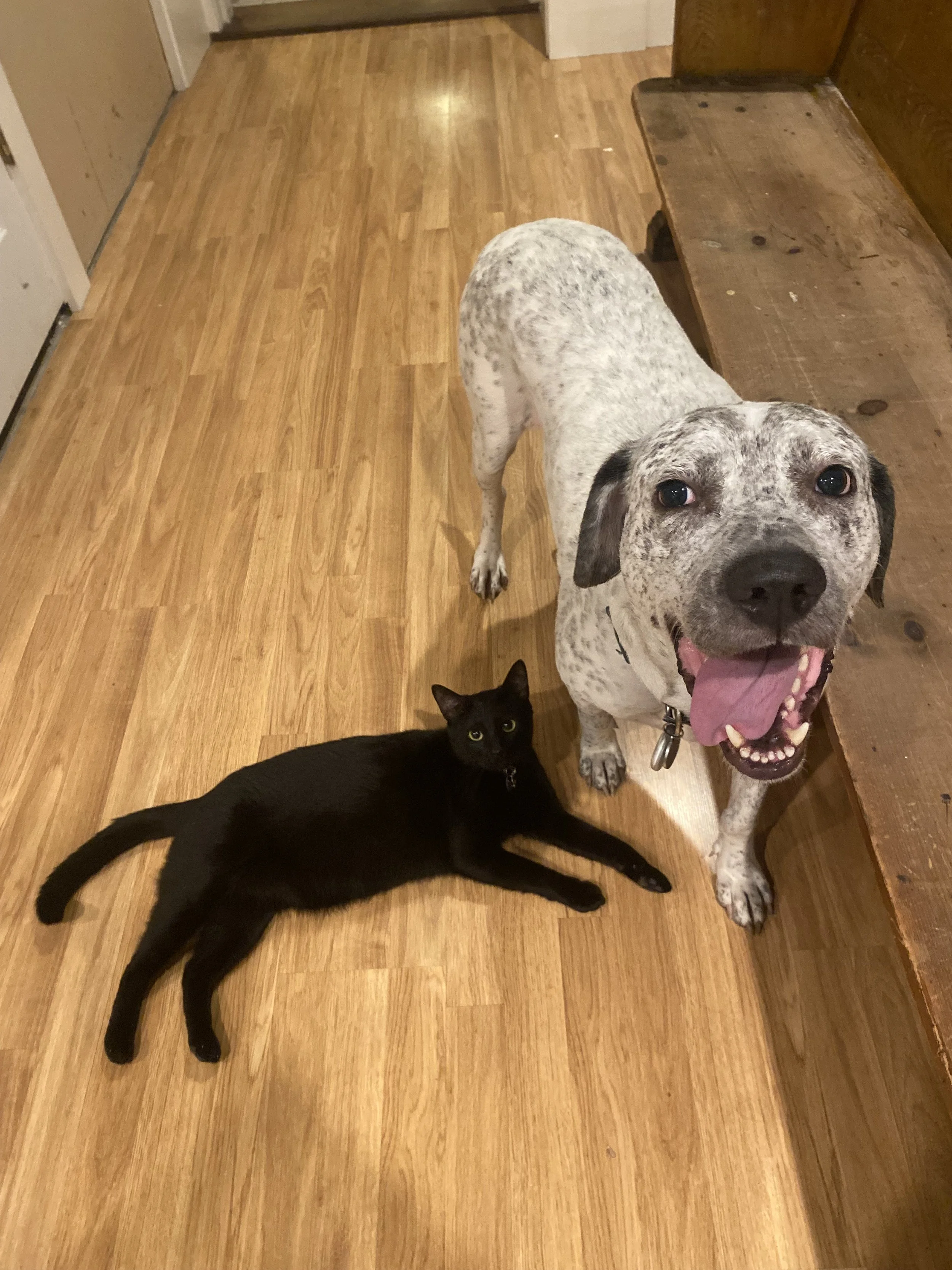 He’s excellent with my foster cats, he sleeps in my bed with them.